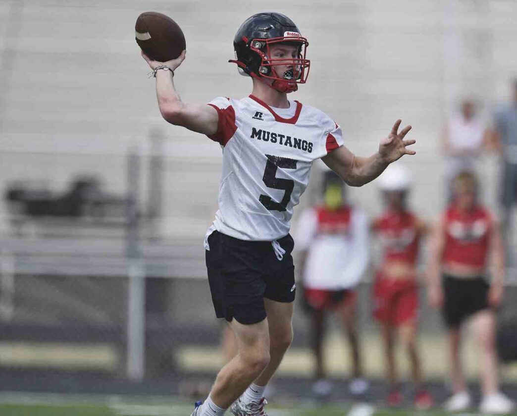 Mathews quarterback Trenton Hyde throws a pass during a 7-on-7 passing scrimmage at Liberty High School.