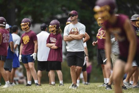 Correspondent photo / Robert Hayes First-year South Range head football coach David Rach oversees his offense during a 7-on-7 tournament at Salem High School this summer. Rach is taking over for longtime South Range head coach Dan Yeagley, who led the Raiders to a state championship last season.