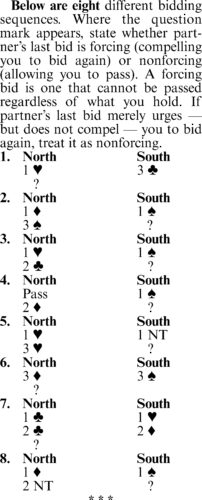 1. Forcing. A jump-shift by responder is forcing to at least game. 2. Nonforcing. If South has only six or seven points for his one-spade bid, he does not have to bid again. 3. Nonforcing. North’s failure to jump-shift limits him to at most 18 points. South therefore can pass if he has a ...