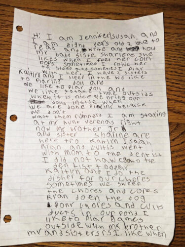 Hi, I am Jennifer Susan and I am 8 years old. I like to read and write and hold my baby sister Sharlene. She likes when I feed her corn pops.