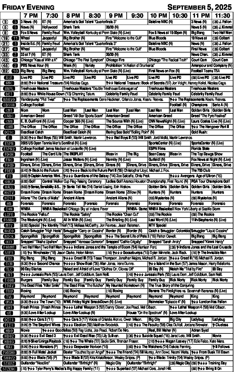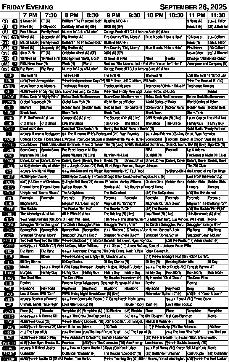 Friday evening listings Friday evening listings NewsletterToday's breaking news and more in your inboxEmail(Required) I'm interested in (please check all that apply)(Required) Daily Newsletter Breaking News Obituaries Are you a paying subscriber to the newspaper?(Required) Yes No Lifestyles Exciting to see spring flowers A success story: My heirloom tomato plants MONDAY EVENING TV LISTINGS Valley Grows calendar Here are upcoming gardening events through the Ohio State University Extension Office. For more information and a ... HINTS FROM HELOISE: Crock pot makes for easy prep DEAR HELOISE: For years, I hosted Thanksgiving for my husband’s family, which usually consisted of around 15-20 ... TO YOUR GOOD HEALTH: Reality of cancer returning hits hard DEAR DR. ROACH: I read your column every day. In a recent column. you wrote: “Since age is the major risk factor ... Starting at $3.23/week. Subscribe Today