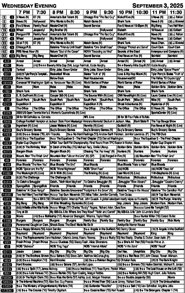 Wednesday night TV listings Wednesday night TV listings NewsletterToday's breaking news and more in your inboxEmail(Required) I'm interested in (please check all that apply)(Required) Daily Newsletter Breaking News Obituaries Are you a paying subscriber to the newspaper?(Required) Yes No Lifestyles Make cooking for a crowd more manageable Milestone moments like graduations, birthdays and wedding anniversaries are worthy of celebration. When such ... WEDNESDAY EVENING TV LISTINGS HINTS FROM HELOISE: Use tablet to read your newspaper DEAR HELOISE: This is in response to the several recent complaints about the obsolescence of printed newspapers. I ... Lovina’s 8-year-old granddaughter pens the column DEAR ANNIE: How to handle in-laws who hurl subtle insults DEAR ANNIE: I have been married for 12 years to a good man whom I love very much, but I dread nearly every holiday, ... A freezer full of stock and a handful of shiitakes Starting at $3.23/week. Subscribe Today