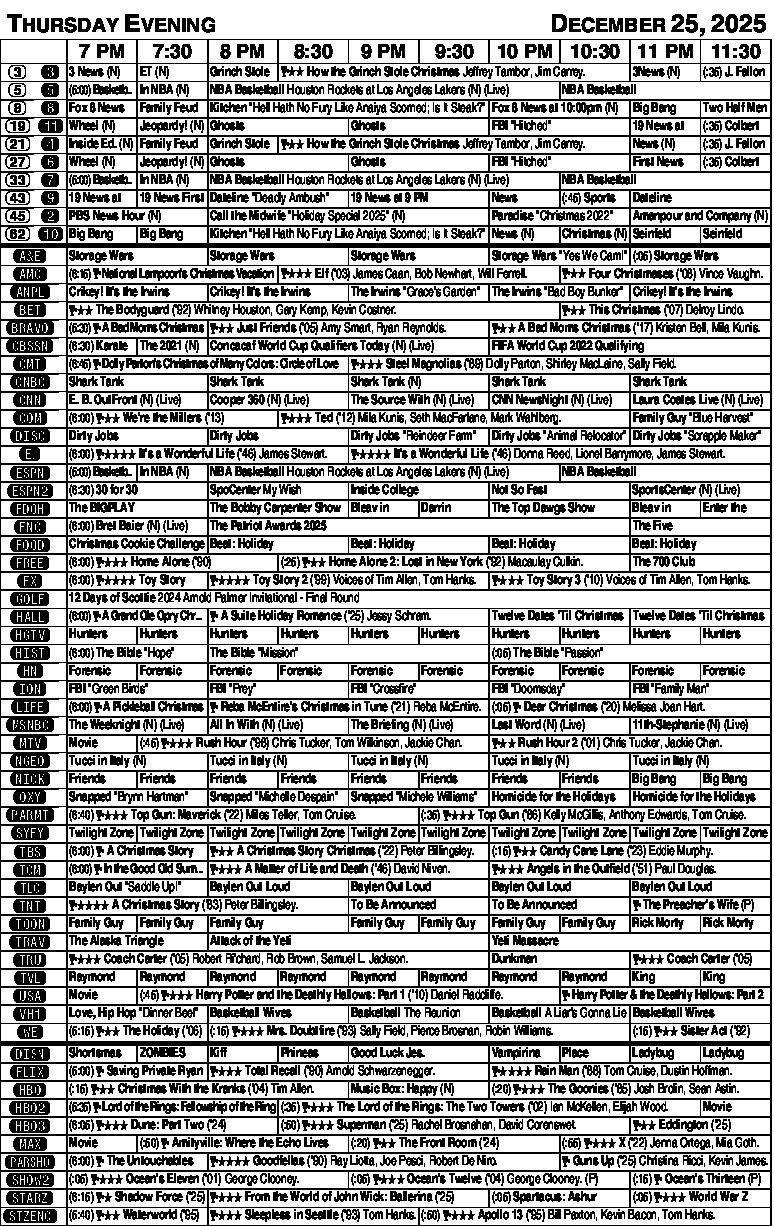 TV Listings for Thursday, Dec. 25, 2025 NewsletterToday's breaking news and more in your inboxEmail(Required) I'm interested in (please check all that apply)(Required) Daily Newsletter Breaking News Obituaries Are you a paying subscriber to the newspaper?(Required) Yes No Lifestyles CT scans beat X-rays for cancer detection DEAR DR. ROACH: When I was about 6 years old in the early 1940s, my 16-year-old brother was sent to a sanitarium ... Call the utility company DEAR READERS: Tonight is Christmas Eve, and I’m reminded of something I heard a wise man say many years ago: ... Daughter writes about family and physical challenges It’s Thursday morning. Daniel just left for work at 3:45 a.m. I feel so lucky that I get to stay home where ... TV Listings for Wednesday, Dec. 24, 2025 TVWed122425 Bridge by Steve Becker Let’s say you’re declarer at three notrump and West leads the jack of hearts. You count your sure tricks and ... Tuscan flatbread is a gluten-free option In Tuscany, schiacciata — which is pronounced skee-ah-CHA-tah and roughly means “crushed,” “flattened” or ... Starting at $3.23/week. Subscribe Today
