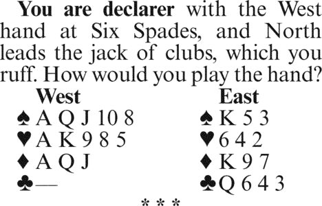 First, you should conclude that the slam cannot be made if the trumps are divided 4-1. This is because if either defender had four trumps and you drew them, you’d have no more trumps and would automatically go down two. You therefore start by assuming a 3-2 trump division.