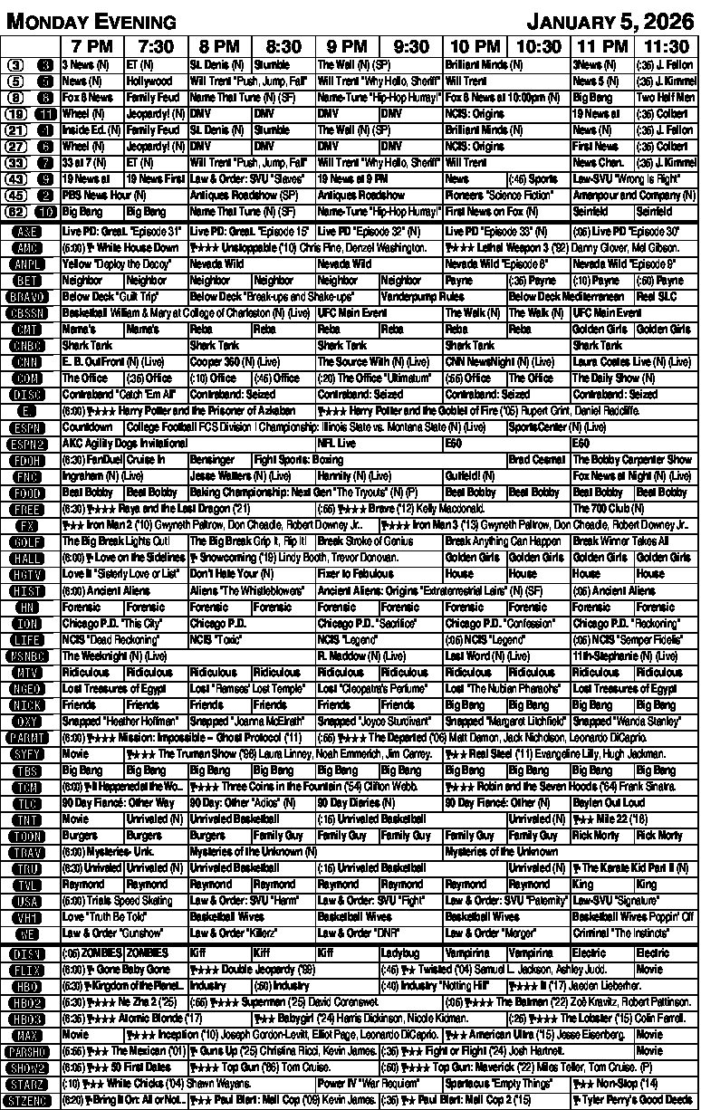 Monday evening TV listings Monday evening TV listings MONDAY EVENING TV LISTINGS MONDAY EVENING TV LISTINGS NewsletterToday's breaking news and more in your inboxEmail(Required) I'm interested in (please check all that apply)(Required) Daily Newsletter Breaking News Obituaries Are you a paying subscriber to the newspaper?(Required) Yes No Lifestyles TO YOUR GOOD HEALTH: Man, 77, baffled by ‘poop sweats’ DEAR DR. ROACH: I have such a minor question that I do not think you would want to publish it, but I’ve been ... Keep Your Move in the Tube Just in time for heart month, St. Elizabeth Youngstown Hospital has announced the successful implementation of Keep ... Colorectal cancer is rising in younger adults Bridge by Steve Becker It did not take North-South very long to arrive at their best contract. South’s five-notrump bid was the Grand ... HINTS FROM HELOISE: Keeping dust at bay DEAR HELOISE: When cleaning small or hard-to-reach areas, I rely on a handheld vacuum with a brush attachment. ... Price of Paxlovid to treat COVID-19 is shocking Q. My husband got COVID-19 last fall. He has had great success with Paxlovid in the past, when he got it for free ... Starting at $3.23/week. Subscribe Today