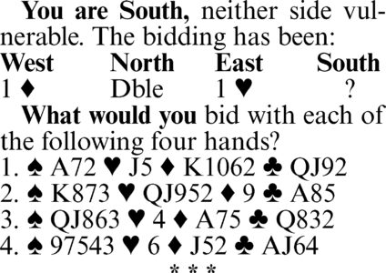 3. Two spades. This hand offers a good chance for game opposite a typical takeout double, and you should let partner know this by jumping to two spades (invitational). Partner’s double implies spade support, so the only question is how strong his hand is. If you evaluate your hand on a point-count basis, you have nine points in high cards and three more points for your singleton heart. Some players might even jump directly to four spades, which is certainly a reasonable alternative.