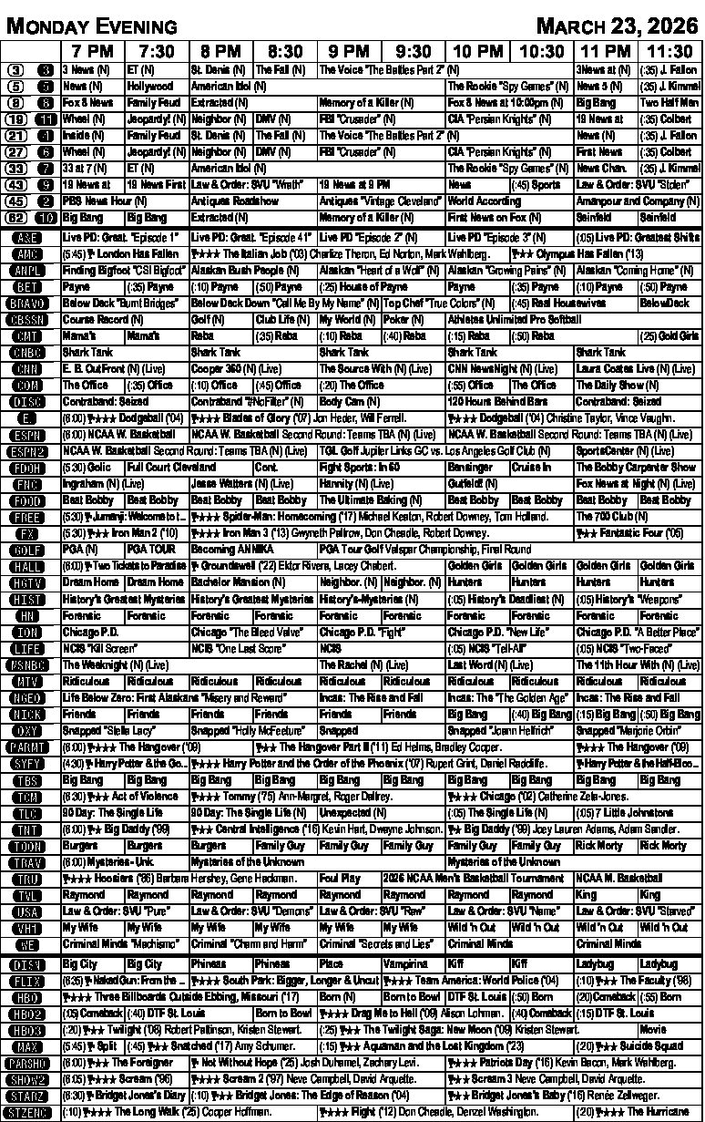 MONDAY EVENING TV LISTINGS
