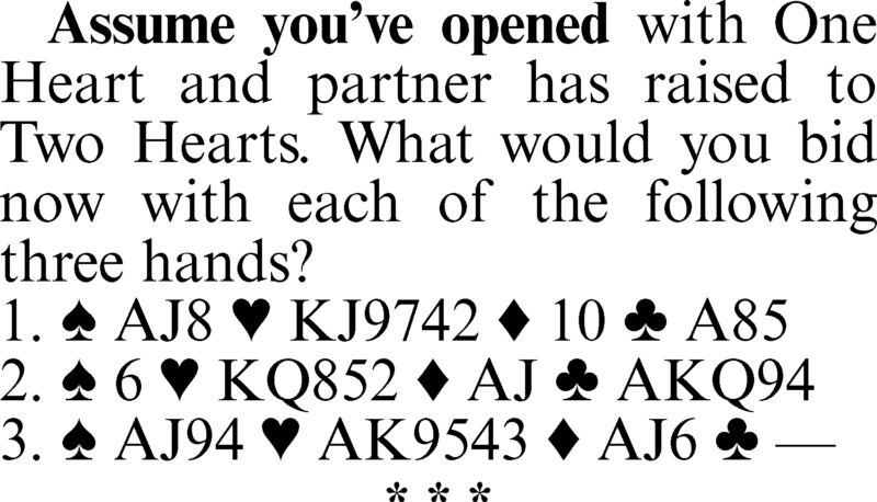 1. Three hearts. Although you have only 13 high-card points, there is a reasonable chance of making 10 tricks, so you should not throw in the towel by passing. Also, for those optimists who see the world through rose-colored glasses, it would be wrong to leap straightaway to four hearts. ...