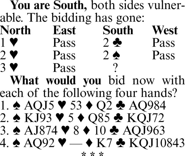 1. Four hearts. Naturally, you are reluctant to raise partner with only two trumps, but there are times when you have to. It is certainly reasonable to assume partner has at least six hearts after he has bid the suit three times, so any two trumps constitute sufficient support.