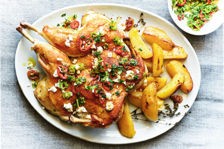 The chef Michael Mina has a method for grilling chicken that turns it crisp outside and seasoned all the way through. He soaks a spatchcocked chicken in a feta brine overnight. Then he dries it well and cooks it under the weight of a smaller oven-safe skillet or Dutch oven.