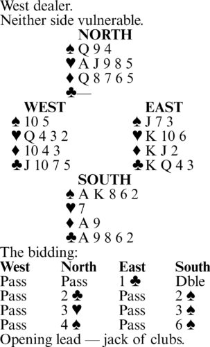 1. Win the heart king with the ace, draw trump and lead a low diamond toward dummy’s J-4! This gives you about a 75% chance for the contract, which is much better than the 50% chance you’d have if you started the diamonds by leading one from dummy.