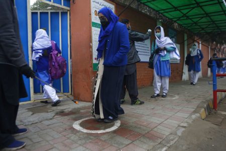A worker sprays sanitizer on the shoes of students wearing face masks to prevent the spread of the coronavirus as they arrive at their school in Lahore, Pakistan. Pakistani authorities started to reopen schools in phases despite a steady increase in deaths and infections from the coronavirus, official said. (AP Photo/K.M.Chaudary)