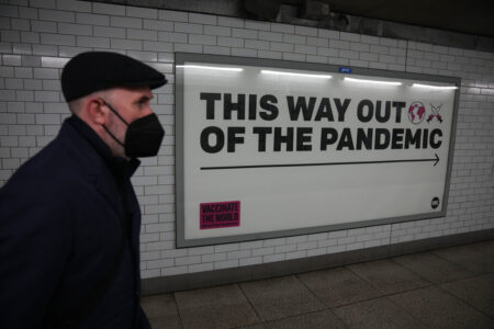 A man wearing a face mask to curb the spread of coronavirus walks past a health campaign poster from the One NGO, in an underpass leading to Westminster underground train station in London. Scientists are warning the British government not to weaken the country’s ability to monitor and track the coronavirus when Prime Minister Boris Johnson ends the requirement for people in England to self-isolate if they contract COVID-19. Johnson will announce details today in Parliament on the government’s plan for “living with COVID.” (AP Photo/Matt Dunham, File)