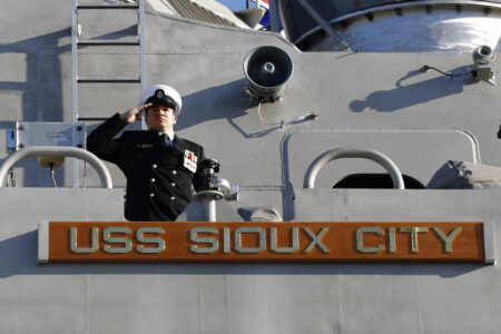 A member of the USS Sioux City salutes from the Freedom-class of littoral combat ship, during the ship's commissioning ceremony in 2018 at the U.S. Naval Academy in Annapolis, Md. The Navy that once wanted smaller, speedy warships to chase down pirates has made a speedy pivot to Russia and China and many of those ships, like the USS Sioux City, could be retired. The Navy wants to decommission nine ships in the Freedom-class, warships that cost about $4.5 billion to build. (AP Photo/Patrick Semansky, File)