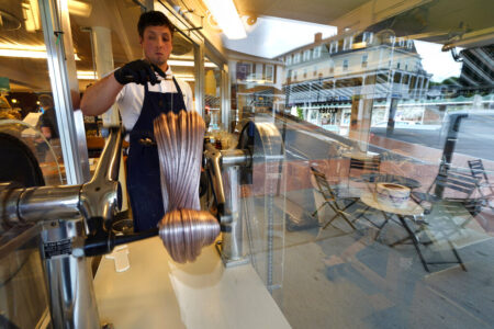 Tyler Melanson makes taffy in the front window of The Goldenrod, a popular restaurant and candy shop Wednesday in York Beach, Maine. Many businesses are struggling to find enough workers before the busy tourism season. (AP Photo/Robert F. Bukaty)