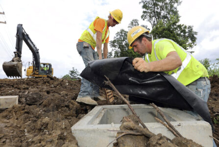 Taylor Purdy, right, a pipe layer with Complete General Construction, and colleague Adam Clary install temporary silt protection for a catch basin near the new Intel semiconductor manufacturing plant construction site in Johnstown, Ohio. Ohio’s largest-ever economic development project comes with a big employment challenge: how to find 7,000 construction workers in an already booming building environment when there's also a national shortage of people working in the trades. (AP Photo/Paul Vernon)