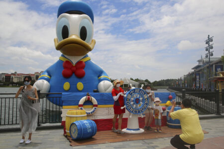 Visitors pose for photos outside the Disney Resort theme park in Shanghai on June 30. Shanghai Disneyland was closed and visitors temporarily kept in the park for virus testing Monday, the city government announced, while social media posts said some amusements kept operating for guests who were blocked from leaving. (AP Photo/Chen Si, File)