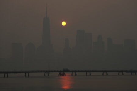 The sun rises over the lower Manhattan skyline this morning, as seen from Jersey. Intense Canadian wildfires are blanketing the northeastern U.S. in a dystopian haze, turning the air acrid, the sky yellowish gray and prompting warnings for vulnerable populations to stay inside. (AP Photo/Seth Wenig)