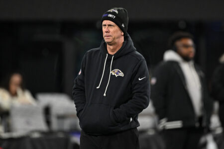 Baltimore Ravens offensive coordinator Todd Monken looks on during pre-game warm-ups before an NFL football game against the New England Patriots, Sunday, Dec. 21, 2025, in Baltimore. (AP )
