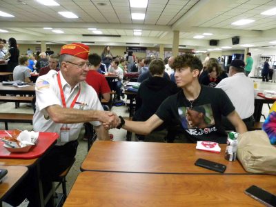Photo by J.T. Whitehouse, Town Crier Fitch sophomore Brandon Popio thanks Marine veteran Ken Jakubec for his service. Both were able to dine in the Fitch High School cafeteria Wednesday during the Eat Lunch with a Veteran program that is in its third year.
