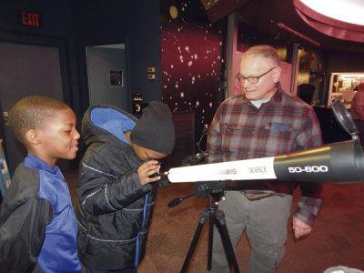 Kaleb McQueen, 8, of Liberty, and his brother Karon McQueen. 10, at telescope, get assistance form Bob Danko of Champion in using a telescope Saturday at YSU.