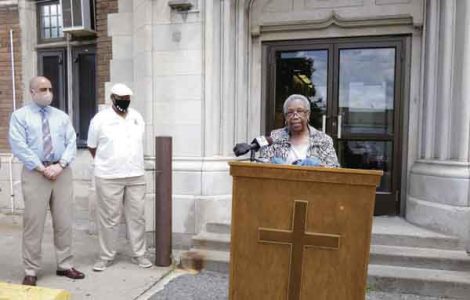 Staff photo / David Skolnick Eugenia Atkinson, retired executive director of the Youngstown Metropolitan Housing Authority, speaks Wednesday outside the Rescue Mission of Mahoning Valley, the former West Federal Branch YMCA building, about preserving the building. Looking on, from left, are Jason Whitehead, the current YMHA executive director, and Jerome Parm, head of the Youngstown Alumni Chapter of Kappa Alpha Psi fraternity. A local coalition hopes the building can be added to the national historic register.