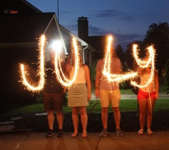 Staff photos / Allie Vugrincic From left, Austin Slutsky of New Albany, Angie Phifer of Warren, Nick Facciolo of Cortland and Samantha Case of Bazetta use sparklers to spell out July last year at a Fourth of July party in Warren.