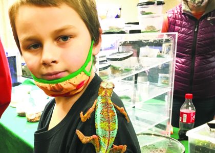 A nonchalant James Wynn, 8, of Vienna, carries on his left shoulder a colorful blue bar ambilobe, a type of panther chameleon that lives in Madagascar. The chameleon was among the large variety of animals on display or for sale during Sunday’s reptile show at the MetroPlex Expo Center in Liberty. Correspondent photo / Sean Barron