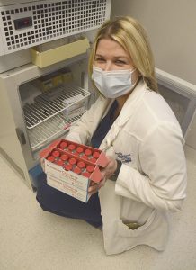Kim Porter of Canfield, a clinical pharmacist at Trumbull Regional Medical Center, holds boxes of the Moderna COVID-19 vaccine that are stored in a freezer at the hospital. CDC statistics show Ohio is seventh in the nation in giving the most COVID-19 vaccines of any state.