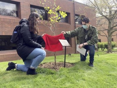 Borawiec, along with Katharine Donnachie, a Legacy Forest student outreach coordinator and senior in the Environmental Sciences Department, unveiled the magnolia tree.