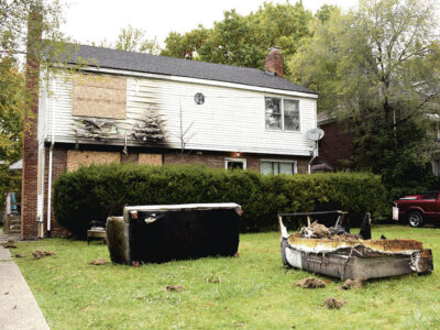 Staff photo / Ed Runyan This is the duplex at 210 E. Midlothian Blvd. on Youngstown’s South Side that was damaged by an arsonist early Sunday. Three children and two adults escaped from the home with minor injuries. Furniture from the home was still in the front yard Monday afternoon. The side that was damaged, on the left, was boarded up.