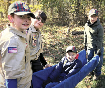 Correspondent photo / Sean Barron.... From left, Jacob Lepsik, Benjamin Cooley, both of Austintown, and Kainan Santucci of Youngstown, demonstrate a stretcher they crafted using a tarpaulin and two poles at the first aid station, which was part of Saturday’s Webelos Woods 2021 event at Camp Stambaugh in Canfield. Playing the victim in the tarpaulin is Gavyn Wackerly of Struthers.