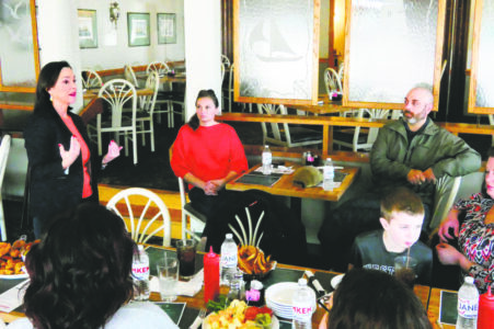 Staff photo / Lily Nickel Jane Timken addresses her audience during her Parents First event. From left are Timken, Ashley Davidson and Austintown Township Trustee Rob Santos.