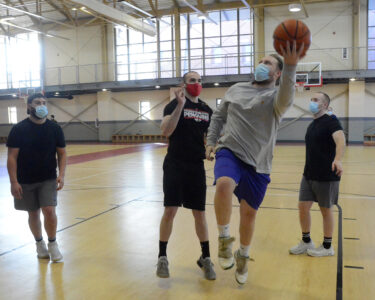 Staff photo / R. Michael Semple .... YSU students get in a game of basketball at the Andrews Wellness Center on Saturday. From left are Devin Ritchie of Mineral Ridge, Jacob Maderitz of Girard, Aaron Frantz of McDonald and Matt Weiss of Girard.