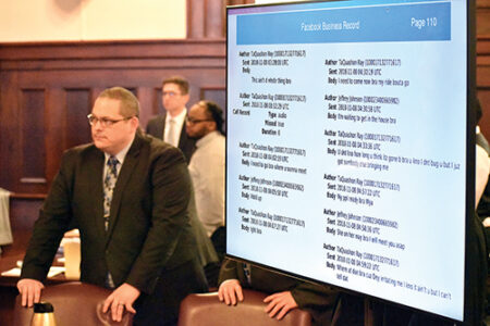 A television monitor in the courtroom Tuesday displayed Facebook messages from the account of Taquashon Ray and another man. The messages were exchanged late Nov. 7, 2018, the night prosecutors say Ray and co-defendant Shaiquon Sharpe killed Edward Morris, his child and the child’s mother in Youngstown. At left is Assistant Prosecutor Aaron Meikle. Staff photo / Ed Runyan
