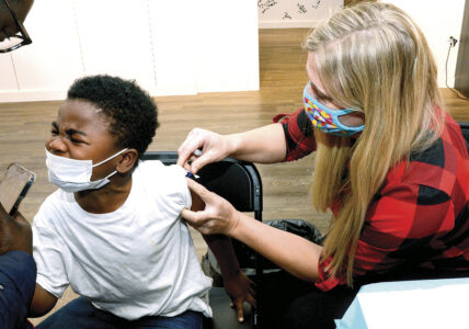 .Brayden Heflin, 7, of Warren, reacts to receiving his Covid-19 vaccine from Trumbull County Combined Health District RN Lindsay Adams of Lordstown during the Covid-19 Vaccine Clinic at the Eastwood Mall Tuesday evening...by R. Michael Semple