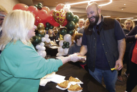 Staff photo / Bob Coupland Joanie Ianazone of Ianazone’s Pizza in McDonald, left, hands pizza to Ron Cabuno of Youngstown at the Slice of the Valley fundraiser on Sunday at the Eastwood Event Centre hosted by the Warren Rotary Club. The public could sample a variety of pizza from 12 different businesses.