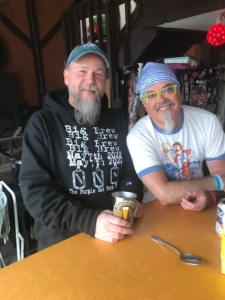 Correspondent photo / Bill Koch Greg Wormley, left, owner of PumpHouse Homebrew Shop in Struthers, shares a moment with Purple Cat founder Jimmy Sutman at the National Homebrew Day at Farmer Casey’s Ranch in Coitsville. The recent event was a fundraiser for the agency, which serves adults with disabilities.