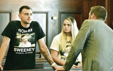 David Sweeney, left, stands with his fiancee, Bailey Williamson, in the courtroom of Judge Anthony D’Apolito on Wednesday after a short hearing in the aggravated murder case of Kimonie Bryant. Bryant is accused of killing Sweeney’s son, Rowan, 4, on Sept. 21, 2020, in a Struthers home. At right is Mahoning County assistant prosecutor Mike Yacovone.