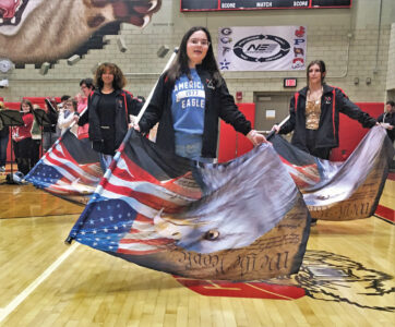 Correspondent photo / Sean Barron The Struthers High School marching band plays its rendition of “God Bless America” during a Veterans Day ceremony Friday in the school gym. In the foreground twirling the flags are, from left, Brianna Day, Carley Johnston and Adriana Bonini.