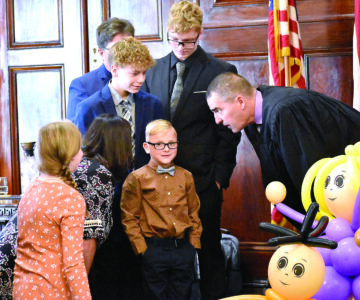 During the ceremony, Judge Robert Rusu of Mahoning County Probate Court followed the legal requirements of an adoption hearing by asking for evidence to substantiate that the adoption is in the best interests of the boy, now 7.