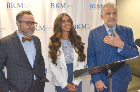 Staff photo / Ed Runyan Attorney Matt Miller Novak, left, of Cincinnati, Trumbull County Commissioner Niki Frenchko and Attorney David Betras held a news conference Monday afternoon at Betras’ law office in Canfield to discuss the federal lawsuit they filed against Trumbull County Sheriff Paul Monroe, Commissioner Mauro Cantalamessa, former county commissioner Frank Fuda and others.