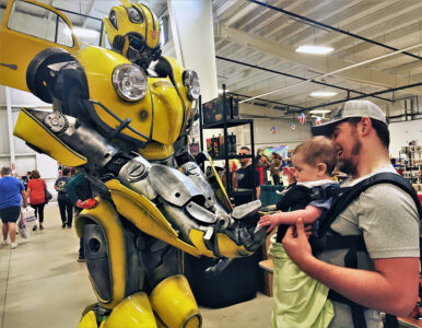 Correspondent photo / Sean Barron Josh Good of Columbiana and his 6-month-old son, Kasetin, meet Bumblebee, an autobot scout from the sci-fi film “Transformers,” during Saturday’s Super Toy event in the Canfield Fairgrounds’ Event Center building.