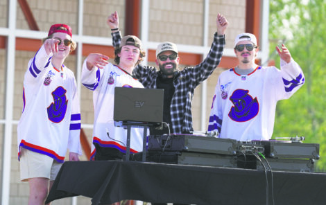 DJ E-V, second from right, greets fans of the Youngstown Phantoms hockey team at the Youngstown Foundation Amphitheatre on Wednesday night. With him, from left, are Blake Bechen, Andrew Strathmass and Chase Pietila. Hundreds came out to the Ignite the Valley rally for the Phantoms, which won its league’s championship Clark Cup last weekend....Staff photo / Greg MacAfee
