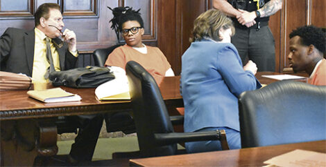 Defendant C’Mone Thomas, second from left, confers with her attorney, Tony Meranto, last week during a hearing in her aggravated murder case. Her brother Marquez Thomas, right, talks to his attorney, Lynn Maro.