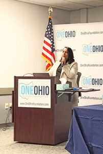 Staff photo / Dan Pompili OneOhio Foundation Executive Director Alicia Nelson speaks at a public forum Monday in Youngstown about fundihg opportunities for opioid recovery and prevention programs.
