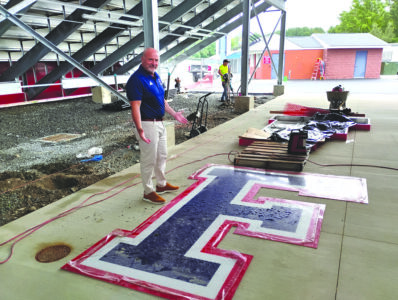Staff photos / Dan Pompili Austintown Schools Superintendent Tim Kelty shows off the faceplate of the Fitch “F” that will mark the front of the new elevator shaft in front of the bleachers. The elevator is set to arrive next week and should be ready to carry guests to the press box and upper-level seating on the home side.
