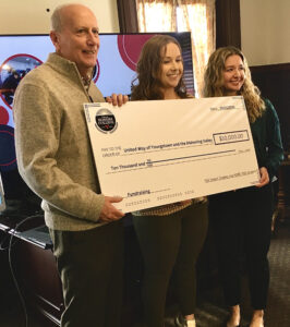 Correspondent photo / Sean Barron Bob Hannon, United Way of Youngstown and the Mahoning Valley’s president, accepts a $10,000 check from Gabe Perrotta, center, and Caitlyn Sapp, both of whom are students in Youngstown State University’s Sokolov Honors College, during a news conference and check presentation Tuesday at YSU.