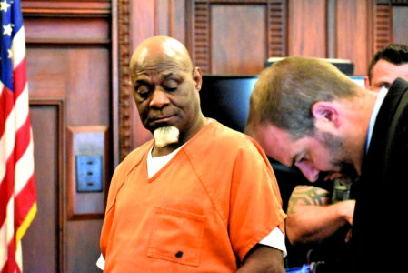 Staff photos / Ed Runyan Terrance Jefferies, 64, of Campbell, left, looks over at his attorney, Mike Yacovone, during his hearing Monday in Mahoning County Common Pleas Court. His bond was increased from $25,000 to $300,000 at the hearing.