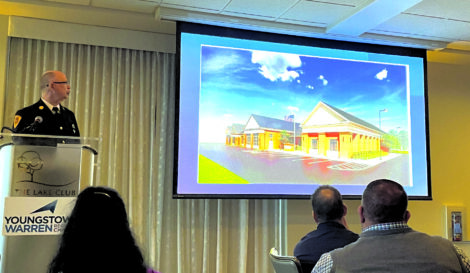 Staff photo / J. T. Whitehouse Western Reserve Joint Fire District fire Chief David “Chip” Comstock displayed a slide showing the proposed addition to Station 93 as the department continues to grow its services while attracting good people. He made the presentation during Wednesday’s Youngstown / Warren Regional Chamber’s Good Evening Poland event.